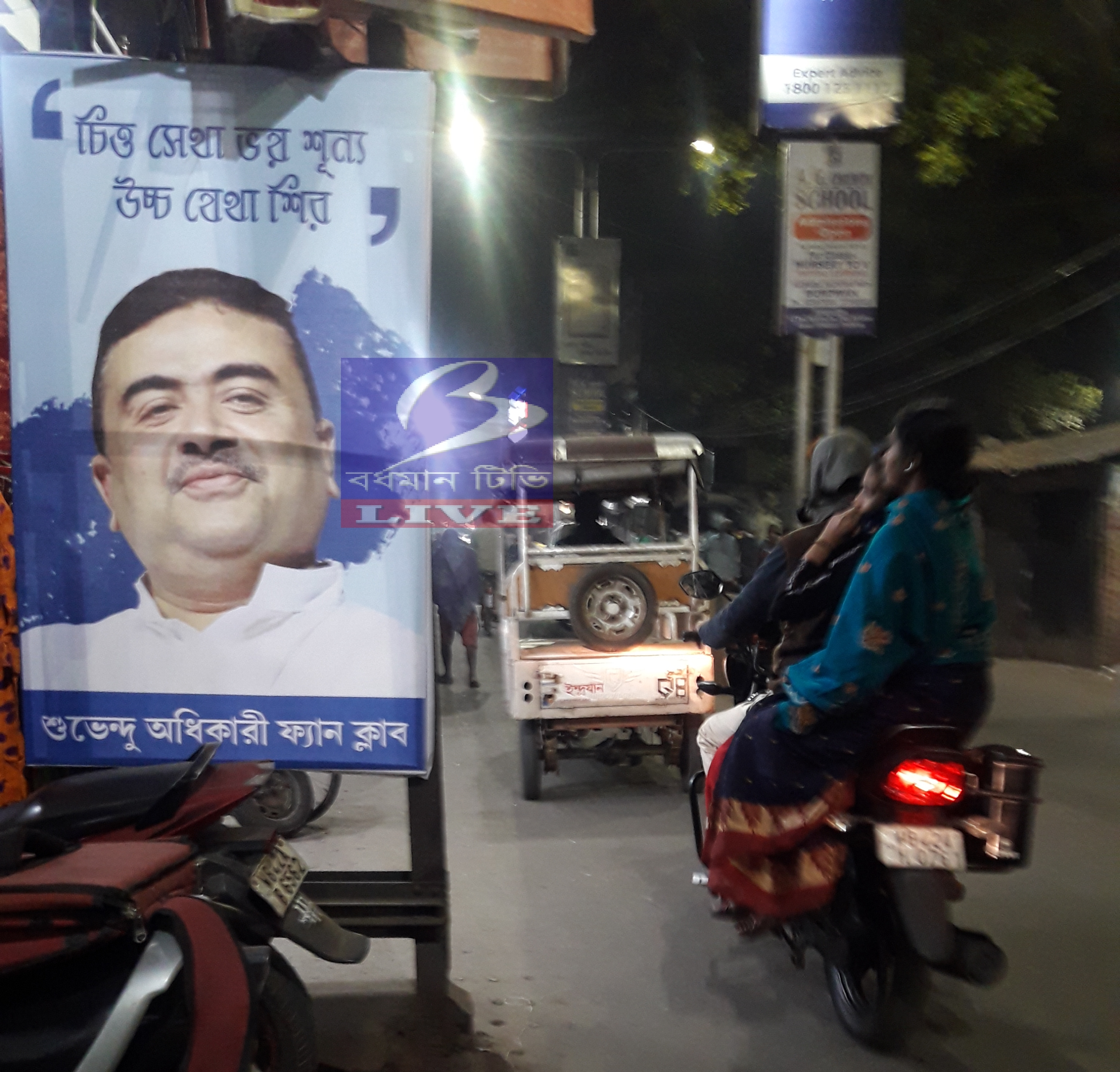 নিজস্ব সংবাদদাতা ( বর্ধমান ) : আমরা দাদার অনুগামী র পর এবার শুভেন্দু অধিকারী ফ‍্যান ক্লাব এর পোষ্টার পড়লো শহর বর্ধমানে । সদর থানার সামনেই লাগানো হয়েছে পোষ্টার । রবি ঠাকুরের কবিতার লাইন উদ্ধৃত করা হয়েছে পোষ্টারে " চিত্ত যেথা ভয় শূন‍্য উচ্চ যেথা শির " । রয়েছে শুভেন্দু অধিকারীর ছবিও । স্বাভাবিক ভাবেই কৌতুহল বর্ধমান শহর এর রাজনীতিতে নতুন করে । ফ‍্যান ক্লাবের সদস‍্য কারা তা অবশ‍্য জানা যায় নি । কারাই বা লাগালো পোষ্টার তা নিয়েও রয়েছে ধোঁয়াশা । অত‍্যন্ত জনবহুল ব‍্যস্ততম এলাকা বিসি রোড । তাও আবার সদর থানার সামনেই । ইলেকট্রিক খুঁটি লাগানো হয়েছে এই শুভেন্দু অধিকারী ফ‍্যান ক্লাব এর প্রচার ব‍্যানার । দিন কয়েক আগেই আমরা দাদার অনুগামীদের পোষ্টার পড়েছিল উল্লাস মোড় , আরজি ভবন , সব্জী বাজার , টাউন হল এর প্রবেশ দ্বার সহ একাধিক জায়গায় । এবার পড়লো ফ‍্যান ক্লাব এর নামে পোষ্টার ।